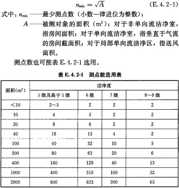 E.1.4 對于單向流潔凈室,可采用室截面平均風速和截面積乘積的方法確定送風量,垂直單向流潔凈室的測定截面取距地面0.8m的無阻隔面(孔板、格柵除外)的水平截面,如有阻隔面,該測定截面應(yīng)抬高至阻隔面之上0.25m;水平單向流潔凈室取距送風面0.5m的垂直于地面的截面,截面上測點間距不應(yīng)大于1m,一般取0.3m。測點數(shù)應(yīng)不少于20個,均勻布置。