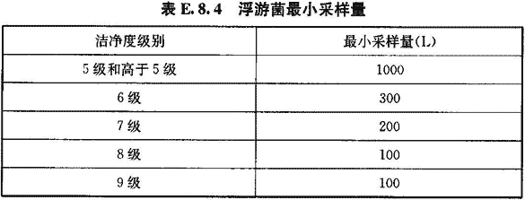 4 每點采樣1次,如工藝無特殊要求,每次采樣量應(yīng)大于等于表E.8.4推薦的浮游菌最小采樣量。