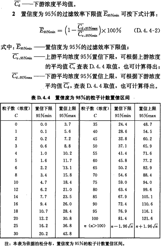 2 應(yīng)根據(jù)上游95%置信下限的粒子濃度Cu,95%min和過(guò)濾器最大允許透過(guò)率(0.01%),計(jì)算下游允許最大濃度,再根據(jù)表D.4.4查得或計(jì)算下游允許最大濃度的95%置信下限濃度Cd,95%min。