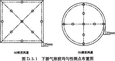 2 可在過(guò)濾器下游(或混勻裝置下游)適當(dāng)距離處,選擇一斷面,在該斷面上至少布置9個(gè)采樣管,采樣管為開口迎向氣流流動(dòng)方向的剛性金屬管,管徑應(yīng)盡量符合常規(guī)采樣儀器的等動(dòng)力采樣要求,其中5個(gè)采樣管在中心和對(duì)角線上均勻布置,4個(gè)采樣管分別布置于矩形風(fēng)道各邊中心、距風(fēng)道壁面25mm處(圖D.3.1a)。圓形風(fēng)道采樣管布置采用類似原則進(jìn)行(圖D.3.1b)。應(yīng)在氣溶膠發(fā)生器穩(wěn)定工作后(此時(shí)被測(cè)過(guò)濾器上游氣溶膠濃度至少應(yīng)為進(jìn)行效率測(cè)試試驗(yàn)時(shí)下限濃度的2倍以上),對(duì)每個(gè)測(cè)點(diǎn)依次進(jìn)行至少連續(xù)3次采樣,每次采樣時(shí)間不應(yīng)少于1min,并取其平均值作為該點(diǎn)的氣溶膠濃度檢測(cè)結(jié)果。當(dāng)所有9個(gè)測(cè)點(diǎn)的氣溶膠濃度測(cè)試結(jié)果與各測(cè)點(diǎn)測(cè)試結(jié)果算術(shù)平均值偏差均小于±20%時(shí),可認(rèn)為過(guò)濾器下游氣溶膠濃度均勻性滿足測(cè)試需要。
