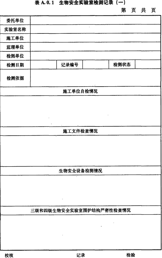 A.0.1 生物安全實(shí)驗(yàn)室施工方自檢情況、施工文件檢查情況、生物安全柜檢測(cè)情況、圍護(hù)結(jié)構(gòu)嚴(yán)密性檢測(cè)情況應(yīng)按表A.0.1進(jìn)行記錄。