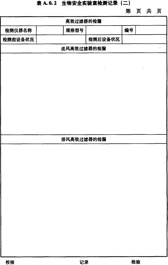 A.0.2 生物安全實(shí)驗(yàn)室送風(fēng)、排風(fēng)高效過(guò)濾器檢漏情況應(yīng)按表A.0.2進(jìn)行記錄。