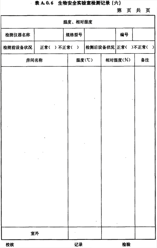 A.0.6 生物安全實(shí)驗(yàn)室房間溫度、相對(duì)濕度的檢測(cè)應(yīng)按表A.0.6進(jìn)行記錄。