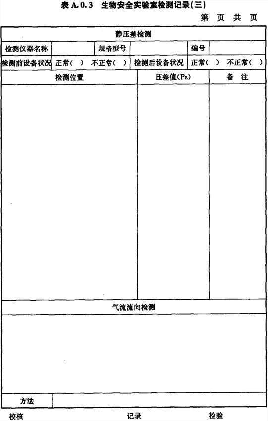 A.0.3 生物安全實(shí)驗(yàn)室房間靜壓差和氣流流向的檢測(cè)應(yīng)按表A.0.3進(jìn)行記錄。