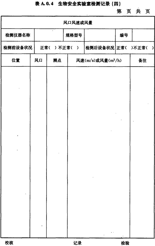 A.0.4 生物安全實(shí)驗(yàn)室風(fēng)口風(fēng)速或風(fēng)量的檢測(cè)應(yīng)按表A.0.4進(jìn)行記錄。