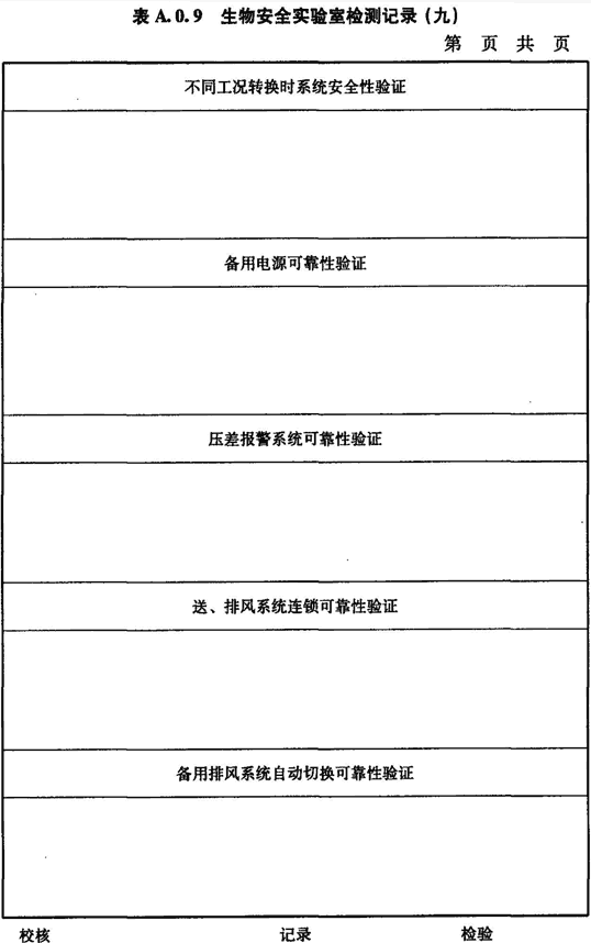 A.0.9 生物安全實(shí)驗(yàn)室配電和自控系統(tǒng)的檢測(cè)應(yīng)按表A.0.9進(jìn)行記錄。