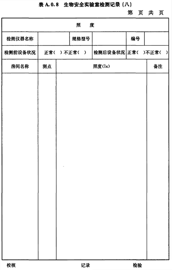 A.0.8 生物安全實(shí)驗(yàn)室房間照度的檢測(cè)應(yīng)按表A.0.8進(jìn)行記錄。