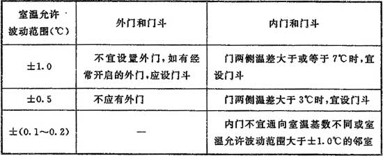 8.1.12 工藝性空氣調(diào)節(jié)區(qū)的門(mén)和門(mén)斗應(yīng)符合表8.1.12的規(guī)定。外門(mén)門(mén)縫應(yīng)嚴(yán)密,當(dāng)門(mén)兩側(cè)的溫差大于或等于7℃時(shí),應(yīng)采用保溫門(mén)。